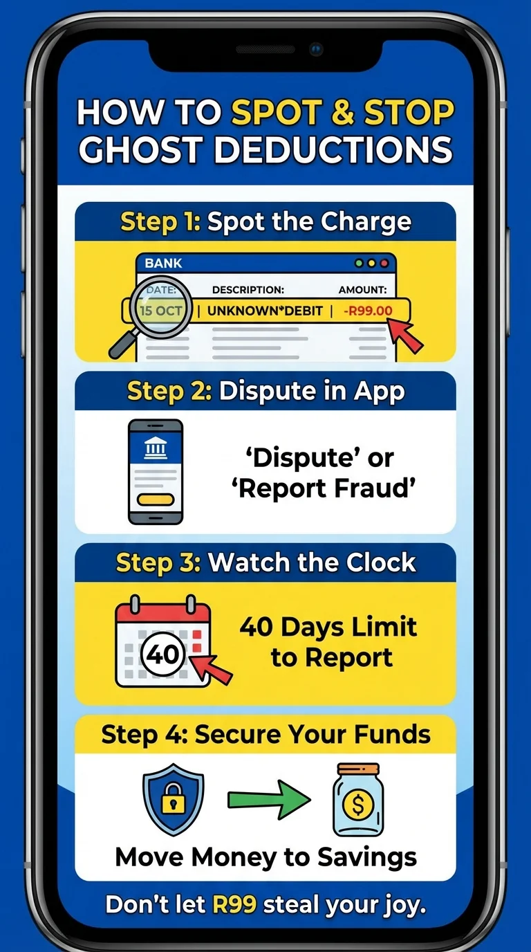 A ‘Ghost Deduction’ is an unauthorized debit order processed against your bank account. These are often for small amounts—typically between R49 and R99—because scammers know that smaller amounts are less likely to trigger immediate panic than stealing the whole R370 or R2,180 at once.