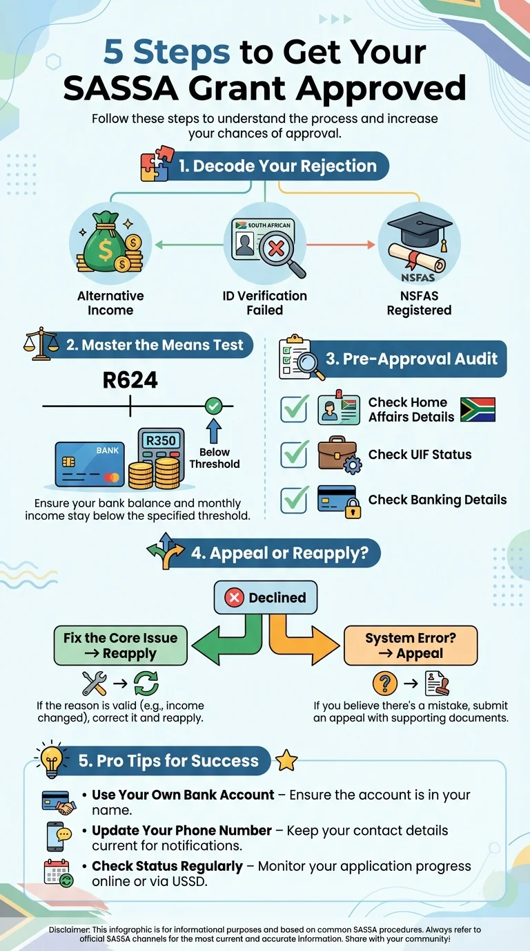 When to Reapply Strategically: Reapplication is for when your circumstances were the problem, but they have now changed. For instance, if you were declined for ‘alternative income’ in November because a relative sent you R800, there’s no point appealing. You did exceed the threshold. The winning move is to ensure your income for December is below R624 and then simply reapply for the next cycle. This is often faster and more effective than a hopeless appeal.